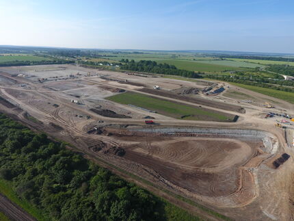Nach den ersten Tiefbauarbeiten sind inzwischen auch die Vorbereitungen für den Bau der Halle angelaufen, deren Erster Spatenstich am 19. Mai stattgefunden hat. Auf allen Flächen, die bebaut oder neu modelliert werden, ist der Mutterboden abgeschoben worden. Vertiefungen für Rückhaltebecken und Fundamente sind freigeschoben worden. Die Trassen der künftigen Verkehrswege und die Lage der großen Halle sind bereits gut erkennbar.