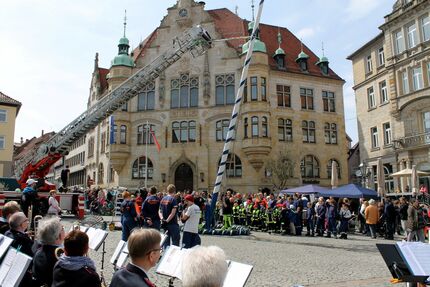 Vor dem Rathaus wird der Baum mit bunten Bändern geschmückt und mithilfe der Drehleiter der Feuerwehr hochgezogen. Das fröhliche Treiben unterstützen die Helmstedter Türmer und Türmermeister Florian Gulaneck hält zum Start in den Wonnemonat Mai einige stimmungsvolle Verse bereit. Bürgermeister Schobert lässt es sich nicht, nehmen und wird das Geschehen auf dem Marktplatz selbst moderieren.