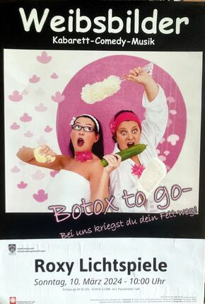 Bereits zum dritten Mal werden die „Die Weibsbilder“ alias Anke Brausch und Claudia Thiel aus der Eifel in Helmstedt erwartet. Am 10. März, 10 Uhr, laden die beiden Damen im Rahmen des Weltfrauentages mit ihrem Kabarett-Programm „Botox to go“ in das Helmstedter Roxy-Kino ein.