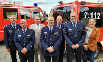 Christian Kahl (Stadtbrandmeister), Manuel Schrader, (neuer Ortsbrandmeister), Wittich Schobert (Bürgermeister der Stadt Helmstedt), Matthias Müller (bisheriger Ortsbrandmeister), Stefan Müller (Abschnittsleiter Nord), Henrik Bangemann (neuer stellvertretender Ortsbrandmeister), Julia Höppner (Leiterin des Fachbereichs Sicherheit und Ordnung der Stadt Helmstedt)