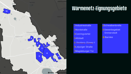In der Stadt Helmstedt wurden 10 Gebiete identifiziert, in denen der Bau eines Wärmenetzes besonders sinnvoll scheint. Diese Bereiche betreffen z. B. die Altstadt, das Conringviertel sowie das Glockberg-/Elzwegviertel.