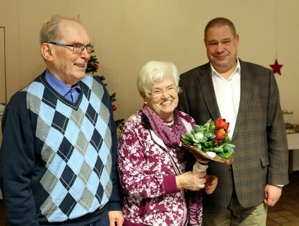 Renate Loos, langjährige Mitarbeiterin der Stadtkasse, und der frühere Schulhausmeister der Grundschule Lessingstraße, Günther Gollmer, erhielten als älteste Teilnehmende jeweils einen Blumenstrauß überreicht. Renate Loos ließ es sich nicht nehmen, einige Worte an die Versammelten zu richten und überreichte selbstgebastelte und beschriebene Weihnachtsgrüße.