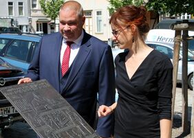 „Die abgebildete Titelseite einer der bekanntesten Tageszeitungen Deutschlands erinnert an die Bedeutung der Teilungsgeschichte für die Bevölkerung in der Region und darüber hinaus“, so Dr. Susan Baumgartl, Leiterin der Gedenkstätte Deutsche Teilung Marienborn, die die Bronze am Bürgermeister Wittich Schobert übergab. „Die Grenze durchschnitt Grundstücke und Felder, Arbeitswege, Familien, Freundes-kreise – und Biographien.“