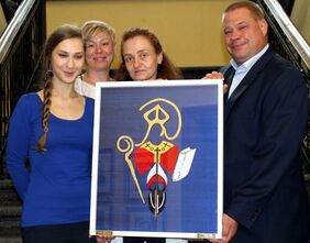 Eugenia Onistschenko (li.) und Roswitha Karrer-Pollak (3. v. l.) präsentieren gemeinsam mit Ina Goschnick (Stadt Helmstedt) und Bürgermeister Wittich Schobert das Helmstedter Exponat