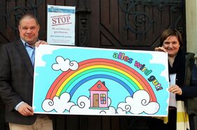 Bürgermeister Wittich Schobert und die Wirtschaftsförderin Nicole Job präsentieren die Malvorlage für den Regenbogen im XXL-Format