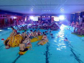 Diverse Spielgeräte wie der bunte Löwe, Water-Totter, Wasserbälle und vieles mehr warteten im Wasser auf die jungen Partygäste. Nebel, Licht und eine bunte Lightshow sorgten für die Disco-Atmosphäre. Spannende Spiele rund um das Wasser begeisterten die Kinder und hielten die Stimmung den ganzen Abend auf hohem Niveau. Höhepunkt des Abends war der „Arschbomben-Wettbewerb“. Die Sprünge vom Drei-Meter-Brett und Fünf-Meter-Plattform wurden mit tosendem Beifall belohnt und als bester Springer wurde Clenn Zenkov gekürt.