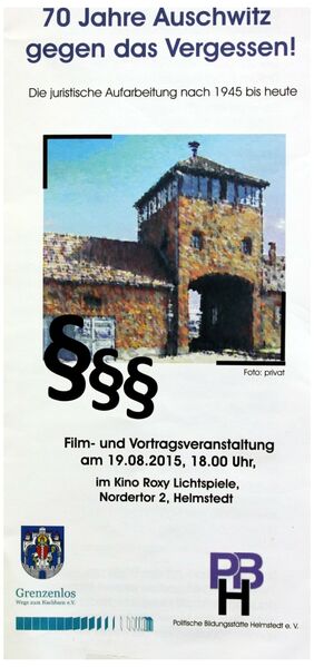 Mit einer Film- und Vortragsveranstaltung zur juristischen Aufarbeitung der Auschwitz-Verbrechen beschäftigt sich am 19. August der Verein Grenzenlos – Wege zum Nachbarn in Kooperation mit der Politischen Bildungsstätte Helmstedt sowie dem Verband der Reservisten der Deutschen Bundeswehr.