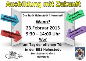 Beim Tag der offenen Tür der Berufsbildenden Schulen des Landkreises Helmstedt informieren Mitarbeiter der Stadt Helmstedt über Ausbildungsmöglichkeiten bei der Stadt.  Der Tag der offenen Tür findet am Samstag, 23. Februar, 9.30 Uhr – 14.00 Uhr in der Ernst-Reuter-Str. 1 statt.