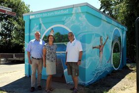 Auf diese Weise machten sie aus dem zuvor unscheinbaren elektrischen Zweckbau einen echten Hingucker. Versehen wurde das Objekt nämlich mit Schwimm-Impressionen aus dem nahegelegenen Waldbad Birkerteich. Bei einem Ortstermin wurde die Arbeit der Fassadengestalter nun von Bürgermeister Wittich Schobert, Avacon-Kommunalreferentin Antje Klimek und Martin Lehmann, Vorsitzender des Fördervereins Waldbad Birkerteich, in Augenschein genommen. Alle drei zeigten sich von der Umsetzung begeistert.