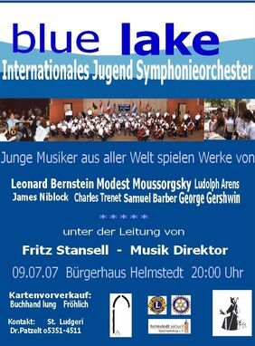 Montag, 09.07.07 großes Dankeschönkonzert mit dem Jugend Symphonie Orchester aus Blue Lake um 20.00 Uhr im Bürgerhaus Helmstedt. Ein hochkarätiges musikalisches Feuerwerk erwartet sie. Lassen sie sich das nicht entgehen.