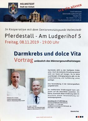 In Kooperation mit dem Seniorenstützpunkt Helmstedt bietet die Gleichstellungsbeauftragte der Stadt Helmstedt am 8. November im Pferdestall einen Vortrag zur Darmkrebsvorsorge anlässlich des Männergesundheitstages an.