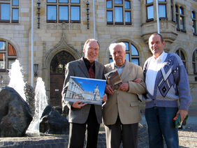 Mit einer Reise in die Stadt seines Nachnamens erfüllte sich der in Dresden wohnhafte Heinz Helmstedt einen lang gehegten Wunsch. Heute, an seinem 87. Geburtstag hat er sich diesen Wunsch erfüllt und wurde von Bürgermeister Heinz-Dieter Eisermann im Rathaus empfangen. Begleitet wurde der rüstige Witwer von seinem guten Freund Toni Fleischmann. „Um 7 Uhr sind wir in Dresden bei Nebel aufgebrochen“ erzählt er. Bekannt sei ihm Helmstedt schon lange gewesen, „insbesondere als ehemalige Universitätsstadt“, erklärt der gelernte Polsterer und Dekorateur, der später 27 Jahre als Busfahrer tätig war. Nun habe ihn sein Freund mit dieser Reise nach Helmstedt zum Geburtstag überrascht. „Diesen Geburtstag werde ich ganz bestimmt nicht vergessen“ ist sich Heinz Helmstedt sicher. Helmstedts Bürgermeister überreichte zur Erinnerung an den Besuch einen Bildband von Helmstedt und freute sich über den mitgebrachten Dresden-Kalender. „Meine Ärzte sagen ich werde 100, dann komme ich wieder“ kündigt Helmstedt abschließend an.