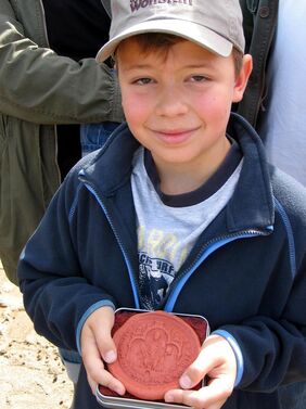Foto 2: Lasse Grundmann zeigt das Stadtwappen, dass mit Tonerde vom Ziegelberg hergestellt wurde.