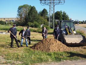 Mit dem symbolischen ersten Spatenstich haben Feuerwehrführung, Politik und Verwaltung den Startschuss für den Bau des Feuerwehrgebäudes zwischen Reinsdorf und Offleben unmittelbar an der Kreisstraße 21 gegeben. Der Massivbau erhält neben einer Fahrzeughalle mit vier Stellplätzen einen eingeschossigen Funktionstrakt mit Büros, Umkleide-, Sanitär- und Schulungsräumen für bis zu 70 Feuerwehrkameradinnen und Kameraden einschließlich der Jugend- und Kinderfeuerwehr. „Die voraussichtlichen Baukosten belaufen sich auf rund 2,6 Mio. Euro. Bis zum Herbst 2021 soll das Gebäude fertiggestellt werden“, teilt Bürgermeister Wittich Schobert mit.