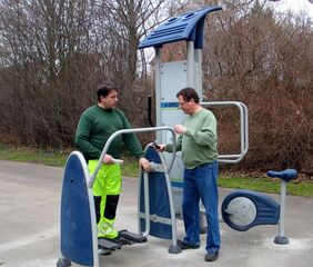 Foto: Burkhard Rabe (li.) und Guido Kuschenek freuen sich, dass das Fitnessgerät rechtzeitig zum Frühjahrsbeginn montiert werden konnte