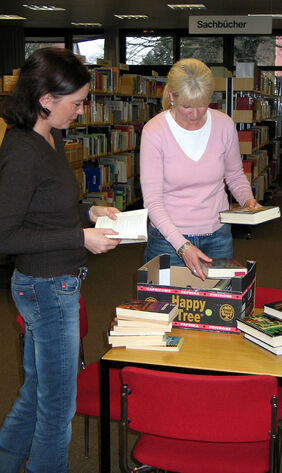 Stellen die Bücher für den Buchflohmarkt zusammen: Karen Zingel und Yvonne Bowman aus der Stadtbücherei