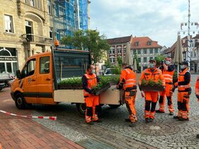 Zahlreiche Blumenkästen mit insgesamt 286 Geranienpflanzen haben Mitarbeiter des städtischen Betriebshofes heute am Rathaus-Altbau und am Gebäude Erbprinz verteilt. In den Blumenkästen an der Rathausfassade sind es genau 206 Pflanzen und am Erbprinz 80 Pflanzen. Mit der Geranien-Pracht an der Fassade bietet das Rathaus immer wieder ein schönes Fotomotiv.