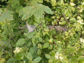 Von Mai bis Juni leben die Raupen in weitläufigen feinen Gespinsten, wobei häufig ganze Büsche überzogen und entblättert werden. Die Raupen benagen die Rinde der Zweige. „Das Fressen stellen die Motten ungefähr vier bis fünf Tage vor der Verpuppung ein“, informiert Böhme. Die Verpuppung findet von Juni bis Juli in einem dichten weißen Sammelgespinst statt, so dass sich das Problem an Büschen und Bäumen danach erledigt hat.