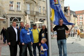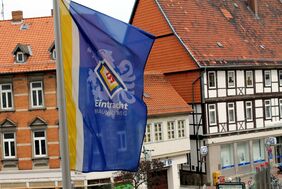 Das freut die Eintracht-Fans: Helmstedts Bürgermeister Wittich Schobert ließ die Eintracht-Braunschweig-Flagge als Glückwunsch der Stadt für den Aufstieg in die 1. Liga vor dem Helmstedt Rathaus aufziehen.