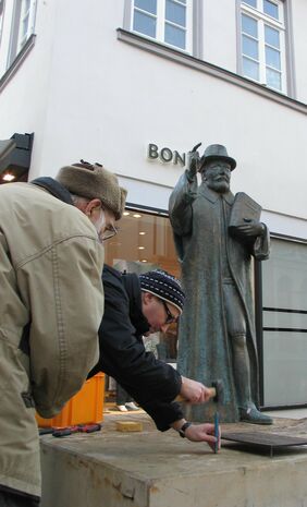 Nachdem der Sockel des Herzog-Julius-Denkmals an der Neumärker Straße/Ecke Collegienstraße durch die eintretenden Plusgrade am Wochenende wieder schnee-frei wurde, konnte heute die Erläuterungsplatte für die Bronzeplastik des Herzog-Julius angebracht werden. Die Montage nahm Steinmetz Hardy Girod aus Weddel mit Unterstützung des Künstlers Georg Arfmann vor. Mit dabei waren auch die Gat-tin des Künstlers sowie der Initiator des Julius-Denkmals, Hans Jörg Kurdum.