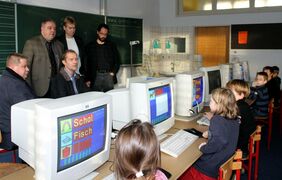 Machten sich direkt im Klassenzimmer ein Bild von der gelungenen IT-Kooperation: v.l. Helmstedts Bürgermeister Wittich Schobert, Grundschullehrer Volker Weidemann, stehend v.l.: Samtgemeindebürgermeister Nord-Elm Matthias Lorenz, Immo Ulbricht (Stadt Helmstedt) und Schulleiter der Grundschule An der Schunter Christoph Müller