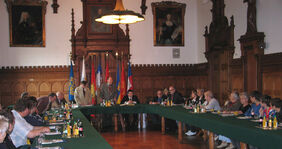 Gern möchte ich unser heutiges Zusammentreffen dazu nutzen, Ihnen einiges über die Stadt Helmstedt zu erzählen. Erstmals urkundlich erwähnt wurde Helmstedt im Jahre 952; unsere Stadt kann als ehemalige Universitäts- und Hansestadt auf eine lange, bewegte Vergangenheit zurückblicken. In dem Saal, in dem wir uns hier befinden, werden nicht nur die Besucher der Stadt empfangen, sondern auch die Sitzungen des Rates der Stadt Helmstedt abgehalten.