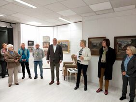 Ein großer Genuss war die Rede von Pfarrer a. D. Harry Köhler aus Esbeck. Nach Grußworten der Vereinsvorsitzenden Petra Schadebrodt sowie des Schirmherrn der Ausstellung, Bürgermeister Wittich Schobert, gelang es Herrn Köhler mühelos, die Anwesenden in seinen Bann zu ziehen. Am Ende seiner kurzweiligen Ansprache zur Ausstellungseröffnung hatte er eine Überraschung im Gepäck. Ein Gemälde wurde vor aller Augen „enthüllt“ von dem selbst die Organisatoren der Ausstellung nichts wussten: eine wunderschöne, schneebedeckte Harzlandschaft.