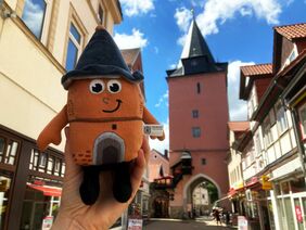 Kugelschreiber und Kaffeetassen sind die typischen Angebote, wenn es um die Eigenwerbung geht. Die Stadt Helmstedt hat sich nun allerdings etwas Originelles einfallen lassen, denn der neue knuffige Kuschel-Hausmannsturm steht seinem Denkmal-Kollegen in der Neumärker Straße in kaum etwas nach. „Außer in der Größe vielleicht“, fügt Bürgermeister Wittich Schobert schmunzelnd an.