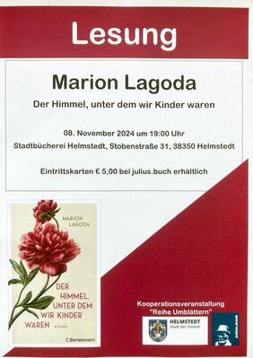Zu einer Lesung am 8. November lädt die Buchhandlung julius.buch in Kooperation mit der Stadt Helmstedt in die Stadtbücherei, Stobenstr. 31, ein. Die Autorin Marion Lagoda liest ab 19 Uhr aus ihrem Roman „Der Himmel, unter dem wir Kinder waren“. Mit feinfühliger Beobachtungsgabe und inspiriert von ihrer eigenen Familiengeschichte erzählt sie von einer Kindheit auf dem Land, einer Kindheit unter Hitler, einer Kindheit, in der Heimat und Widerstand untrennbar miteinander verbunden sind. Eintrittskarten sind für 5 Euro bei julius.buch erhältlich.