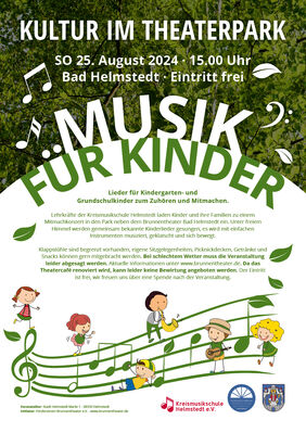 Lehrkräfte der Kreismusikschule Helmstedt laden Kinder und ihre Familien zu einem Mitmachkonzert in den Park neben dem Brunnentheater Bad Helmstedt ein. Unter freiem Himmel werden am Sonntag, 25. August 2024, ab 15 Uhr gemeinsam bekannte Kinderlieder gesungen, es wird mit einfachen Instrumenten musiziert, geklatscht und sich bewegt.