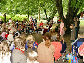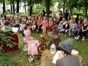 Gegen 16.30 strömten Kinder, Eltern und Großeltern aus allen Richtungen herbei. Für jeden standen Kronen bereit, an einem Schminktisch konnten man sich schminken lassen und ein Märchenrätsel lösen. Unter den Bäumen war passend zu den Geschichten schon alles dekoriert. Bei Schneewittchen hing ein riesiger Spiegel am Baum und im Baum hingen lauter kleine Spiegel und Äpfel. Ruck zuck waren alle Plätze belegt und Schneewittchen wurde erwartet. Cornelia Bosse, verkleidet als Schneewittchen, setzte sich in einen alten Sessel und schlug das Buch auf. Alle hörten gespannt zu und sahen, wie sich Schneewittchen, gespielt von Carla-Maria Klein, von der bösen Stiefmutter vergiften ließ. Zum Abschluss der Geschichte gab es für jeden Besucher einen Apfel, gespendet vom Obsthof Jasper aus Süpplingenburg. In den Pausen konnte man sich am Laugenbrezelstand stärken und mit Getränken erfrischen.