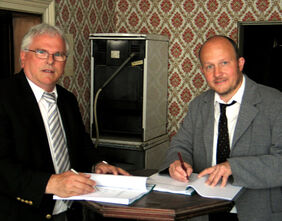 Mit der Unterzeichnung des Modernisierungsvertrages ist ein weiterer Schritt zur Sanierung des historischen Gebäudes Kybitzstraße 23 getan: Stadtbaurat Thorsten Kubiak und Hartmut Krämer von der Firma PKF Lang und Stolz KG unterzeichneten heute den Modernisierungsvertrag für das mehr als 20 Jahre leerstehende Gebäude.
