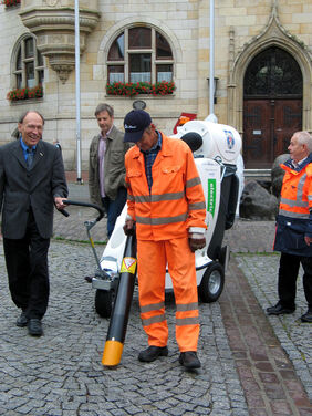 Die Stadt Helmstedt kann ab sofort die Reinigung der Innenstadt weiter intensivieren: Mit dem neuen Stadtmüllsauger soll die bisher vorwiegend per Hand durchgeführte Reinigung der Fußgängerzone und der angrenzenden Straßen erleichtert und optimiert werden. Das elektrisch betriebene Gerät zeichnet sich dabei durch einen äußerst leisen Betrieb und minimale Staubentwicklung aus. „Mit einem derartigen Sauger könnten wir selbst im Sommer direkt vor einem Eiscafé arbeiten, ohne die dort sitzenden Menschen zu belästigen“ beschreibt Fachbereichsleiter Dirk Stein die Vorzüge des Gerätes.