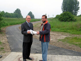 Mit der Asphaltierung eines rund 200 m langen Weges wird nun die Grünanlage Galgenbreite mit dem Tagebausee verbunden. Die Fertigstellung des neuen Weges erfolgte in der vergangenen Woche. Der Spazierweg kann von Fußgängern und Radfahrern genutzt werden, welche nun nicht mehr das Betriebsgelände der Invitel passieren müssen, um den Info-Punkt oberhalb des Sees zu erreichen. Die E-ON stellte das für den Weg benötigte Gelände unbürokratisch zur Verfügung und ermöglichte so den Bau. Im Rahmen dieser Tiefbaumaßnahme erfolgte ebenfalls die Pflanzung von Ulmen und Eschen. Von den 8 Bäumen wurden 4 von den Beteiligten am Friedensgrund-Pfingstcamp, das auf dem Gelände der Begegnungsstätte St. Ludgerus stattfand, gepflanzt. Damit wird die Begegnung der deutschen und osteuropäischen Jugendlichen anlässlich der Solidaritätsaktion "Renovabis" der katholischen Kirche auch für die Öffentlichkeit dokumentiert. Weitere 4 Bäume werden in den nächsten Tagen durch die Stadt Helmstedt gepflanzt.