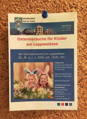 Die Aktion startet am Ende des Büddenstedter Weges (Parkplatz Lappwaldsee). Nach einem kurzen Spaziergang geht es weiter zum Aussichtspunkt am Petersberg . Dort können die Kinder nach Herzenslust nach bunten Ostereiern suchen. „Auch der Osterhase wird natürlich vorbeischauen“, verspricht der Bürgermeister. Es wird gebeten, für die Ostereiersuche eigene Körbchen mitzubringen. Eltern werden gebeten, ihre Kinder zu begleiten.