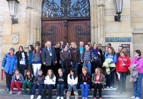 Auf englisch begrüßte der erste stellvertretende Bürgermeister Dr. Karl Birker die Schülerinnen und Schüler der Holyrood Community School aus Chard im Helmstedter Sitzungssaal. Vor dem Empfang bei der Stadt stand eine Schulbesichtigung der Partnerschule, des Gymnasiums Julianum, auf dem Programm. Die Schüler, die erst in der vergangenen Nacht in Helmstedt ankamen, bleiben bis zum nächsten Dienstag. Nach dem Empfang im Rathaus ging es per Stadtrallye auf Entdeckungstour durch die Stadt. Eine Fahrt in die Bundeshauptstadt Berlin steht ebenfalls noch an.