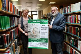 Foto: Stadt Helmstedt: Büchereileiterin Yvonne Bowmann und Eckehart Beichler werben für einen Besuch der Bilderausstellung von Otto Pietzak