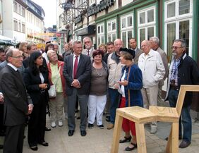 Foto : Auf dem Weg durch die Neumärker zu den einzelnen Stationen der Sitzmöbel; untermalt wurden die jeweiligen Treffpunkte mit Beiträgen von Helmstedter Professoren im historischen Gewand.