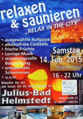Am Valentinstag, 14. Februar, lädt das Julius-Bad-Team von 16 – 22 Uhr zum Relaxen und Saunieren bei Kerzenschein und Lounge-Musik ein. „Wir möchten unseren Gästen ein außergewöhnliches Sauna- und Badeerlebnis bieten“, sagt Henning Thiele von der Bäder- und Dienstleistungsgesellschaft Helmstedt. Zukünftig sollen regelmäßig Motto-Veranstaltungen in Zusammenarbeit mit dem Hallenbad-Restaurantwirt Peter Henne angeboten werden.