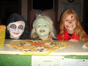 Am Halloweenbuffet warten „Gespensterkekse“, „Horrokuchen“ oder „Gruselmuffins“ auf hungrige Partygäste. Das Betreuerteam zaubert auf Wunsch passende Kunstwerke auf jedes Gesicht. Wer Lust hat, einen Blick in seine Zukunft zu werfen, kann das mit Unterstützung einer Wahrsagerin mit Zauberkugel tun.