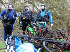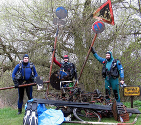 Vier Wochen nach der diesjährigen Frühjahrsputz-Aktion traten sie in Aktion: Sporttaucher nahmen sich am vergangenen Samstag den Stiegerteich vor und brachten Dinge ans Tageslicht, die allem Anschein nach schon lange Zeit im Wasser lagen. In mehreren Tauchgängen im 10 Grad kalten Wasser beförderten die Taucher u. a.diverse Fahrräder, etliche Verkehrsschilder sowie einen Einkaufswagen ans Tageslicht. Auch einige Zuschauer hatten sich eingefunden, um die Säuberungsaktion der Taucher zu beobachten.