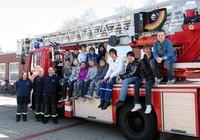 Zuvor hatten die vier Mädchen und 10 Jungen etwas zum Thema Brandschutz von Erika Kornau und Mandy Schmidt erfahren. Neben einem Einführungsfilm konnten die Teilnehmer anhand von kleinen Versuchen dann sehen, wie Feuer gelöscht werden können. Behandelt wurde auch, wie ein Notruf abgesetzt wird. Für das Gruppenfoto versammelten sich die Schüler vor dem Drehleiter-Fahrzeug, wer sich traute, konnte später noch vom Drehleiterkorb einen Blick aus der Vogelperspektive über die Stadt Helmstedt wagen. Hierbei wurden die Standorte einzelner Sehenswürdigkeiten sowie der Schulen genau gezeigt.