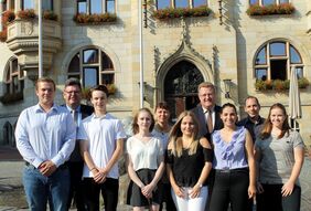 Foto: untere Reihe von rechts: Christina Thomas (20), Sophie Flohr (21), Jadie Simson (21), Pauline Schrobback (19) und Yannick Müller (16) Zum Begrüßungsteam gehörten (ebenfalls untere Reihe): Rudolf Sorge (Jugend- und Auszubildendenvertreter; zweite Reihe von rechts: Can Flechtner (Personalratsvorsitzender), Jörg Stielau (Ausbildungsleiter), Alexandra Müller (Personalservice) und Thomas Bode (Geschäftsbereichsleiter).