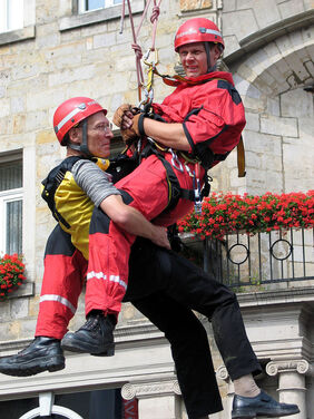 Effektvolle Vorführungen versammelten ein großes Publikum auf dem Marktplatz. Gezeigt wurden verschiedene Einsätze wie z. B. die Behandlung von Gefahrgut, der Einsatz von Lufthebern oder auch die richtige Handhabung von Löschmitteln. Besonderes Highlight an diesem Tag war die Rettung von Bürgermeister Heinz-Dieter Eisermann aus einem Nebengebäude des Rathauses. Gesichert durch die Höhenrettungsgruppe Braunschweig wurde der Bürgermeister aus schwindelnder Höhe gut und sicher zu Boden gebracht. Als besonderes "Bonbon" für eingefleischte VfL-Fans boten die Feuer-wehrkameraden eine Autogrammstunde mit den VfL-Profis Cedric Makiadi und Tom van der Leegte. Große Trauben junger und junggebliebener Fans bildeten sich um den Tisch vor der Bühne. Die beiden VfL-er erfüllten geduldig alle Autogrammwünsche.