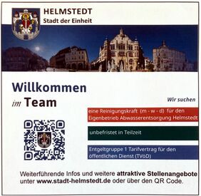 Die Stadt Helmstedt sucht eine Reinigungskraft mit einer wöchentlichen Arbeitszeit von 10 Stunden für den Eigenbetrieb Abwasserentsorgung Helmstedt.