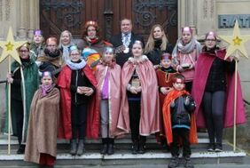Bürgermeister Wittich Schobert freute sich über die Gäste und sprach ihnen seinen Dank für den großartigen Einsatz zugunsten notleidender Kinder aus. Mit dem Kreidezeichen „20*C+M+B+15“ schrieben sie später den Segen an die Rathaustür.