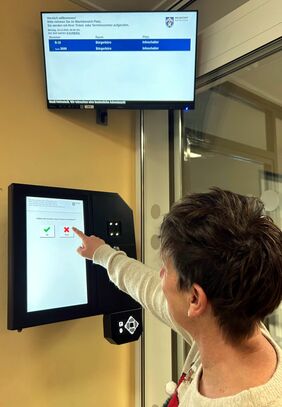 „Neu ist, dass Bürgerinnen und Bürger, die ein Anliegen im Bürgerbüro erledigen möchten, nun eine Wartemarke über das Besucherleitsystem im Eingangsbereich ziehen müssen“, erläutert die zuständige städtische Fachbereichsleiterin Julia Höppner. Für online vorab gebuchte Termine gilt folgendes: „Diese Bürgerinnen und Bürger erhalten mit ihrer Onlinebuchung eine vierstellige Zahlenkombination und einen QR-Code. Sie können sich sowohl über den Scan des QR-Codes oder über die manuelle Eingabe der Zahlen am Terminal zum Termin anmelden“, erläutert Höppner.