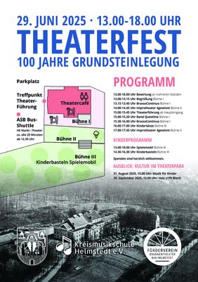 Das Programm findet auf drei Bühnen statt. Verschiedene Musikgruppen verwöhnen Ihre Ohren, Tanzgruppen zeigen ihr Können. Das Improvisationstheater bindet Sie in die Aufführungen ein. Bei einer Theaterführung haben Sie die Möglichkeit, einmal hinter die Kulissen des Theaters zu schauen und auf der Bühne zu stehen. Für den Nachwuchs gibt es Bastelgruppen und das Spielmobil. In unserem schönen Theatercafé und auf der Außenfläche werden Sie kulinarisch verwöhnt. Neben Kaffee und Kuchen gibt es Kaltgetränke aller Art, Flammkuchen, Gegrilltes ... für jeden Geschmack das Richtige. Denken Sie daran, unsere Stuhlkapazität draußen ist begrenzt, bringen Sie gerne einen eigenen Stuhl mit.