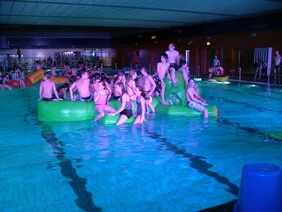 Diverse Spielgeräte warteten im Wasser auf die jungen Partygäste. Nebel, Licht und eine bunte Lightshow sorgten für Disco-Atmosphäre. Spannende Spiele in und rund um das Wasser sorgen für Begeisterung und hielten die Stimmung den ganzen Abend auf hohem Niveau. Beim Hola-Hoop-Wettbewerb konnten die Mädchen ihr Können unter Beweis stellen. Höhepunkt des Abends war der „Arschbomben-Wettbewerb“. Die Sprünge vom Fünf-Meter-Brett wurden mit tosendem Beifall belohnt und als bester Springer wurde Jonas Minge gekürt.