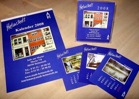 Ab sofort bereichern wieder die limitierten Auflagen der beliebten Tisch- und Wandkalender für das Jahr 2008 das bereits umfassende Angebot in der Info am Markt. Für jeden Monat werden bekannte Motive aus Helmstedt dargestellt. Der Wandkalender kann zum Preis von 5,00 € und der Tischkalender mit CD - Hülle für 4,50 € erworben werden. Beide Kalender erhalten Sie in der Info am Markt, Markt 7/8. Inhaber der Helmstedt-Card erhalten auf Ihren Einkauf die beliebten Bonuspunkte.